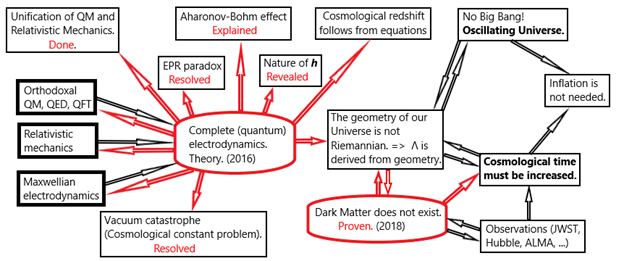 The red frame with smoothed corners highlights the published results. The Complete electrodynamics is published in this paper. The proof that dark matter does not exist is published in this paper. Black arrows go from the red frames – these are proven and published consequences. Thus, “orthodox QM, QED and QFT” + “Relativistic mechanics” + “Maxwell’s electrodynamics” (3 rectangles on the left) were combined into a single theory (Complete Electrodynamics). The unification made in the article is shown by red arrows.