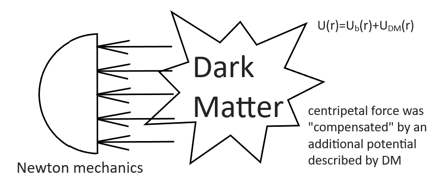 In the first and second cases, incomplete models were considered, but astrophysicists postulated an invisible, unobservable entity (DM), which is a gross error. At the same time, physicists agreed that they did not know something essential and simply introduced the necessary postulates into the basis of a new model (new equations). But they did not introduce a new entity such as “Quantonium matter”, that would correct Newton’s equation and mysteriously explain the quantization of atom within the framework of Newtonian mechanics. In Quantum Mechanics (QM) physicists took the right way, in astrophysics – not.